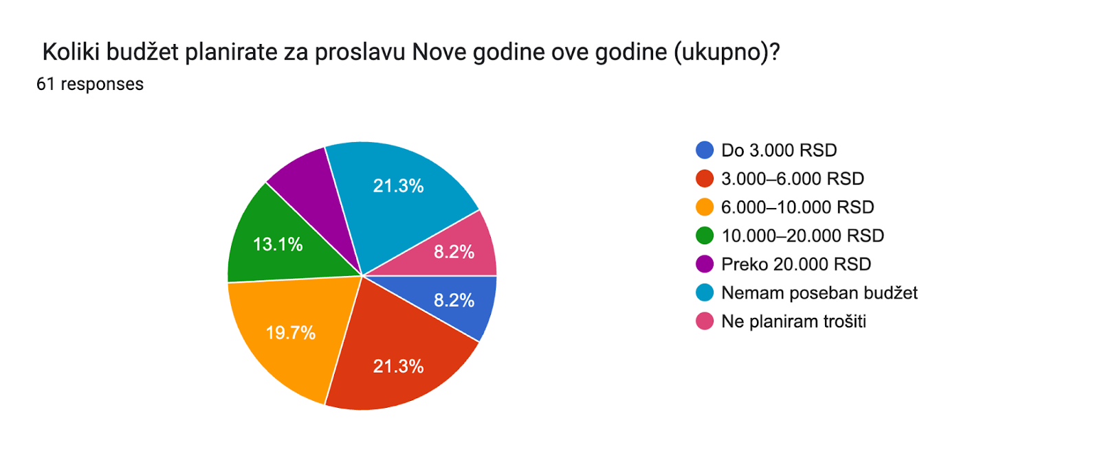 Podaci o planiranom budžetu dodatno oslikavaju oprez sa kojim mladi pristupaju praznicima. Najveći broj ispitanika planira da potroši između 3.000 i 6.000 dinara (21,3%), dok isto toliko navodi da nema unapred definisan budžet. Budžet od 6.000 do 10.000 dinara planira 19,7% mladih, dok se manji procenat odlučuje za veće iznose. Istovremeno, skoro svaki deseti (8,2%) ispitanik navodi da ove godine uopšte ne planira dodatne troškove.