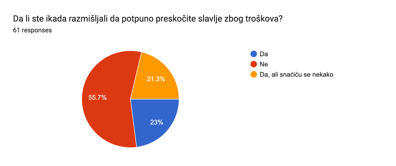 Iako se Nova godina i dalje doživljava kao važan društveni događaj, anketa pokazuje da finansijski pritisak utiče i na samu odluku da li će se slavlje uopšte održati. Skoro četvrtina ispitanika navodi da je razmišljala da potpuno preskoči doček zbog troškova, dok dodatnih 21,3% kaže da je imalo slične dileme, ali da će se „nekako snaći“. Sa druge strane, 55,7% mladih navodi da o preskakanju slavlja nije razmišljalo, uprkos rastu cena.